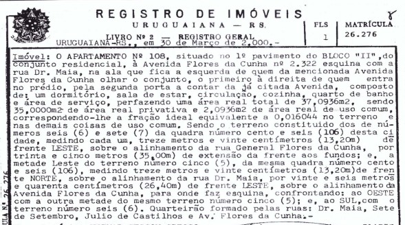Apartamento 108, primeiro pavimento, bloco II, matricula 26.276 RGI, Rua Flores da Cunha 2322. Um dormitorio, sala, cozinha, banheito e área de serviço. Com 35m2 area privativa. Avaliado em R$120.000,00. VALOR MINIMO PARA HOMOLOGAÇÃO A metade do valor da avaliação. FORMA DE PAGAMENTO Em 24h. 1. A vista. 2. Parcelado, com entrada mínima de 25% da arrematação e saldo em até 30 vezes mensais corrigidos. (art 895 CPC). TAXA DE LEILÃO 5% pelo arrematante. VALOR DO INCREMENTO (lances) Fixo. R$1.000,00.